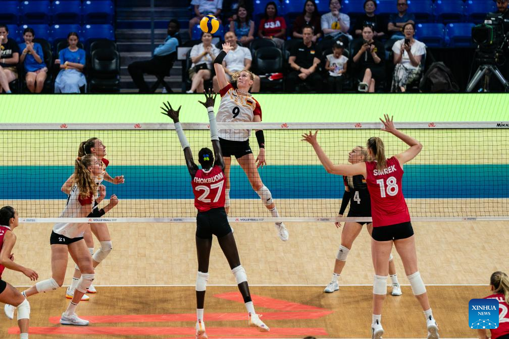 Lina Alsmeier (top) of Germany serves during the Pool 8 match between Germany and Canada at the Women's Volleyball Nations League (VNL) 2025 in Arlington, the United States, July 9, 2025. (Photo by Chen Chen/Xinhua)