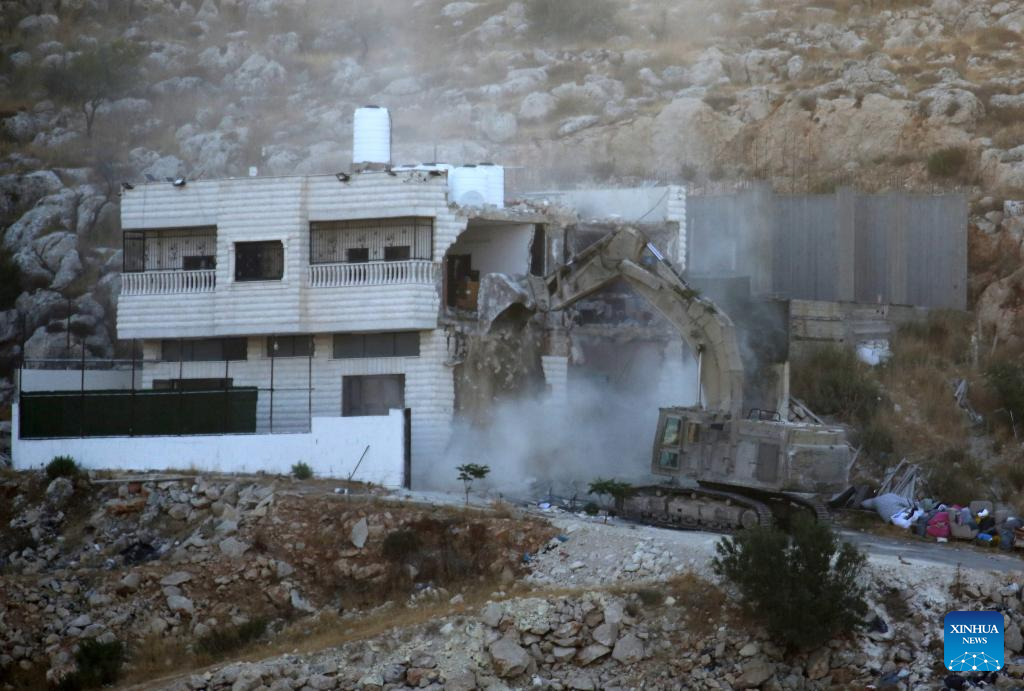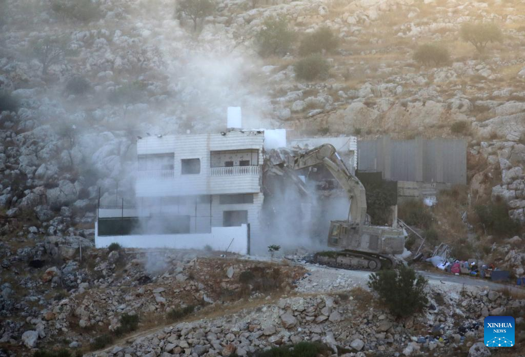 An Israeli excavator demolishes a Palestinian house, in the town of Rujeib, east of the West Bank city of Nablus, on July 9, 2025. (Photo by Nidal Eshtayeh/Xinhua)