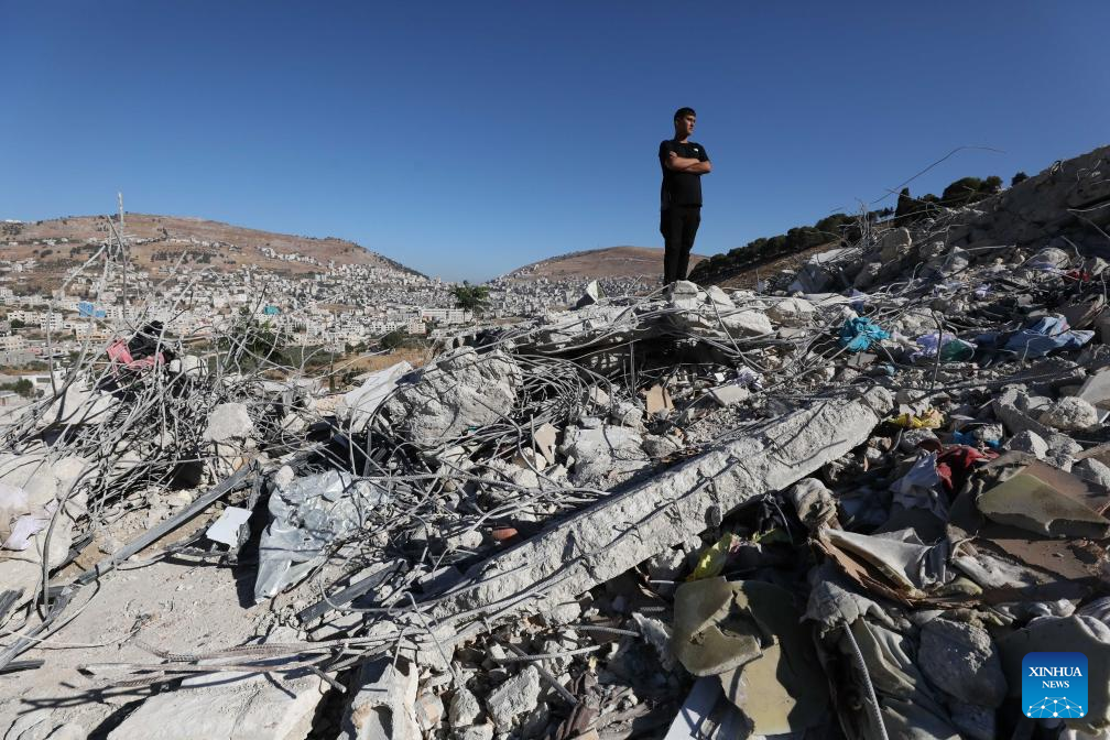A Palestinian inspects the rubble of a house demolished by an Israeli excavator, in the town of Rujeib, east of the West Bank city of Nablus, on July 9, 2025. (Photo by Nidal Eshtayeh/Xinhua)
