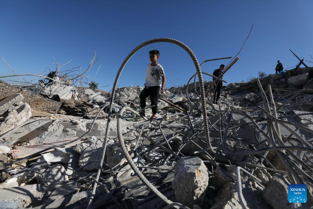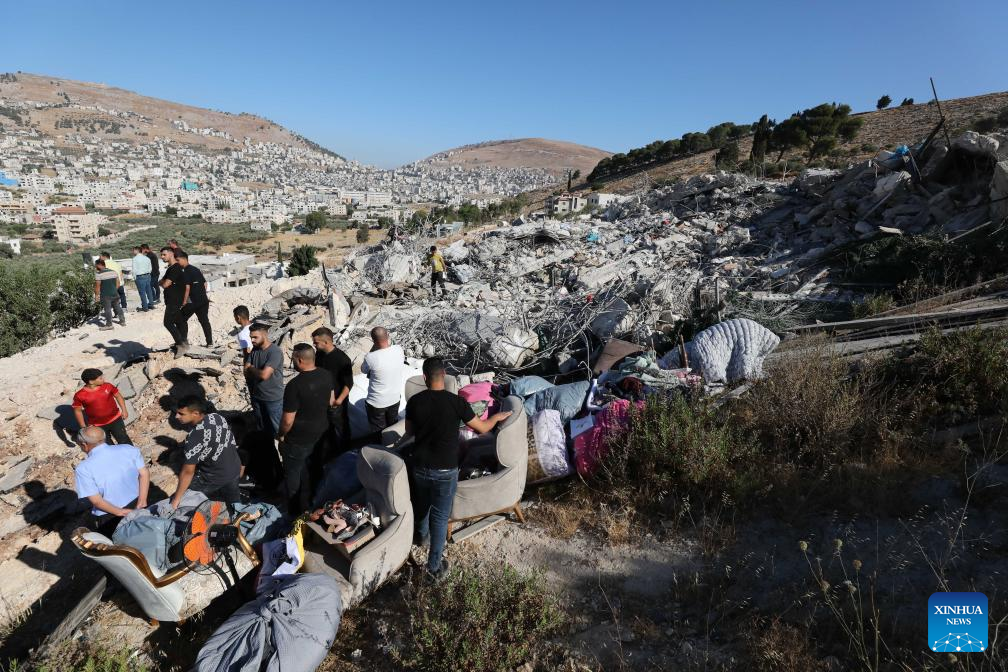 Palestinians inspect the rubble of a house demolished by an Israeli excavator, in the town of Rujeib, east of the West Bank city of Nablus, on July 9, 2025. (Photo by Nidal Eshtayeh/Xinhua)