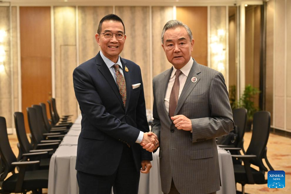 Chinese Foreign Minister Wang Yi, also a member of the Political Bureau of the Communist Party of China Central Committee, meets with Thai Foreign Minister Maris Sangiampongsa in Kuala Lumpur, Malaysia, July 10, 2025. (Photo by Chong Voon Chung/Xinhua)
