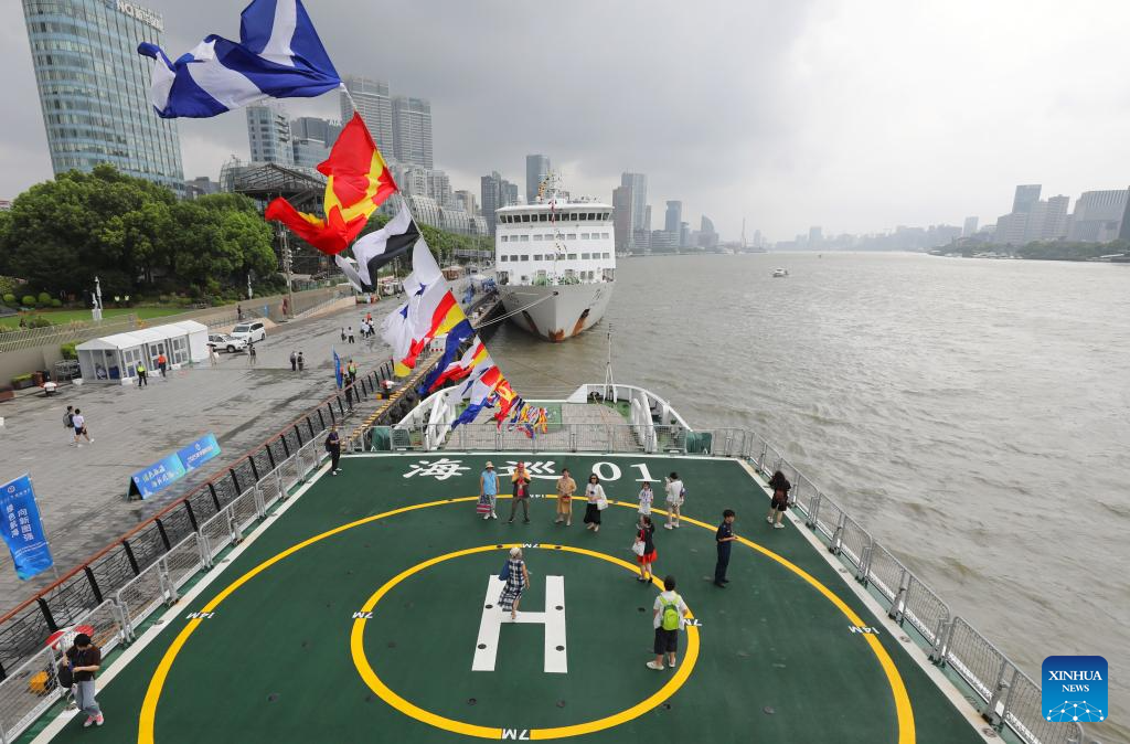 Tourists visit a ship during an open day event at a port in east China's Shanghai, July 11, 2025. July 11 marks the Maritime Day of China. (Xinhua/Fang Zhe)