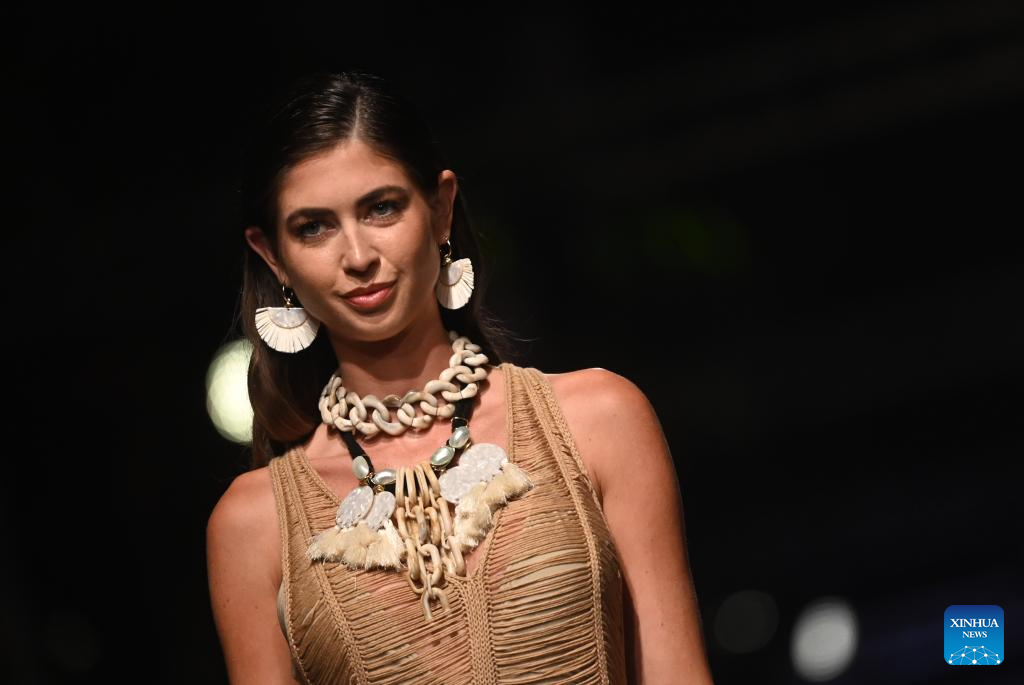 A model presents a creation at 2025 Malta Fashion Week in Valetta, Malta, July , 2025. The event is held here from July 7 to 12. (Photo by Jonathan Borg/Xinhua)