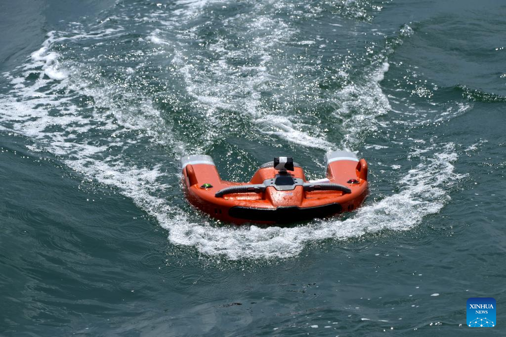 The "Dolphin 3" surface rescue robot conducts test in the northern waters of the South China Sea, July 9, 2025. Chinese researchers successfully carried out scientific tests involving various types of drones, unmanned surface vessels, and autonomous underwater vehicles aboard the "Xiangyanghong 10" in the northern waters of the South China Sea in recent days.