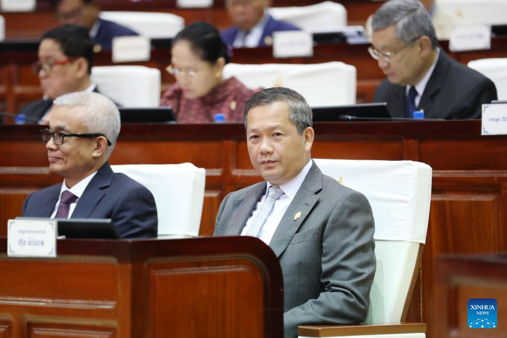 Cambodian Prime Minister Hun Manet (1st R, front) attends a National Assembly session in Phnom Penh, Cambodia, on July 11, 2025. The National Assembly of Cambodia on Friday amended the country's constitution, allowing the government to create a legal framework to revoke Cambodian citizenship from any individuals who conspire with foreign countries to destroy national interests. (Photo by Sovannara/Xinhua)