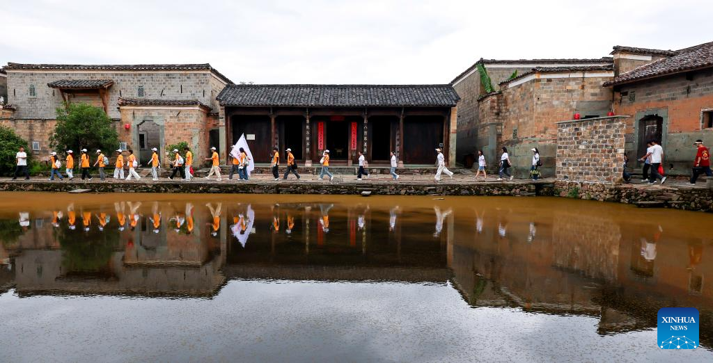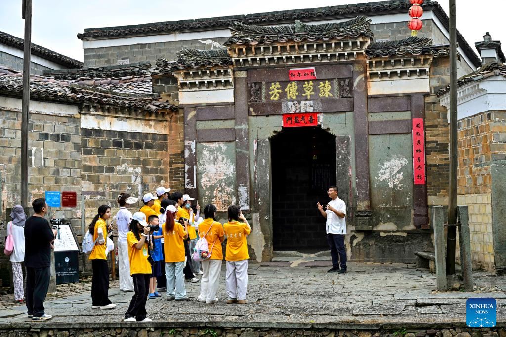 College students visit Zhuqiao Village in Jinxi County of Fuzhou, east China's Jiangxi Province, July 9, 2025. Jinxi County, with centuries-long history, still preserves over 100 ancient villages dating back to the Ming and Qing dynasties (1368-1911), which has won the county fame as an "ancient village museum without bounding walls." Zhuqiao is a prominent representative among the villages, featuring 109 existing ancient buildings from the Ming and Qing dynasties.