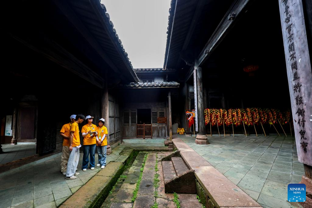 College students conduct research on the protection of historical buildings and the development of cultural tourism in Zhuqiao Village, Jinxi County of Fuzhou, east China's Jiangxi Province, July 9, 2025. Jinxi County, with centuries-long history, still preserves over 100 ancient villages dating back to the Ming and Qing dynasties (1368-1911), which has won the county fame as an "ancient village museum without bounding walls." Zhuqiao is a prominent representative among the villages, featuring 109 existing ancient buildings from the Ming and Qing dynasties.