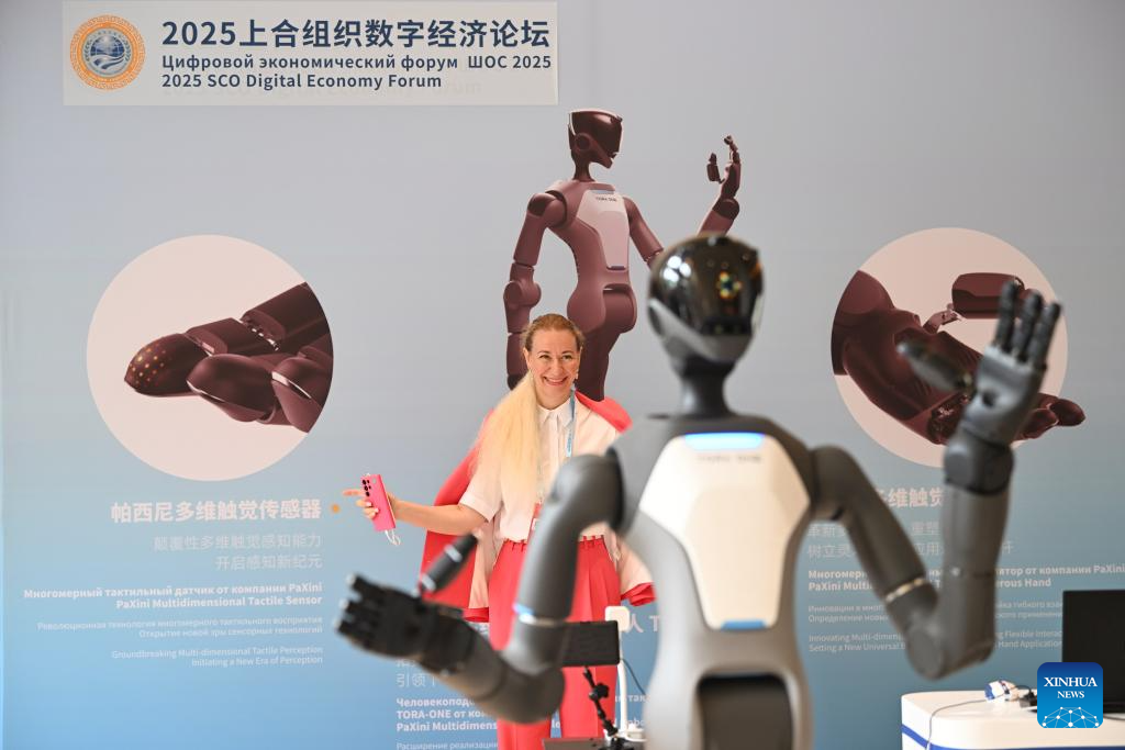 A guest operates a robot during the 2025 Shanghai Cooperation Organization (SCO) Digital Economy Forum in north China's Tianjin, July 11, 2025. Themed "New Bonds in the Digital Economy, New Horizons for Cooperation," the forum was held here Friday. (Xinhua/Li Ran)
