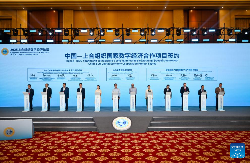 Guests attend a cooperation project signing ceremony during the 2025 Shanghai Cooperation Organization (SCO) Digital Economy Forum in north China's Tianjin, July 11, 2025. Themed "New Bonds in the Digital Economy, New Horizons for Cooperation," the forum was held here Friday. (Xinhua/Zhao Zishuo)