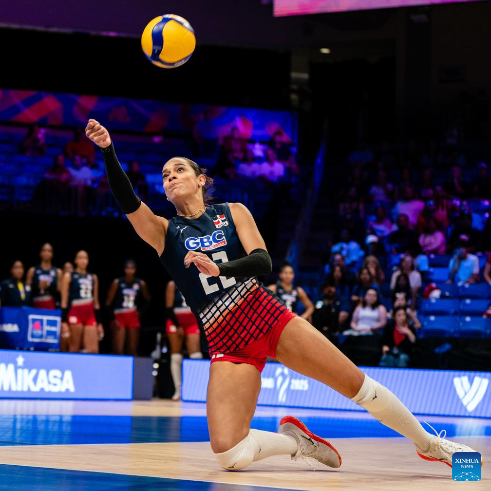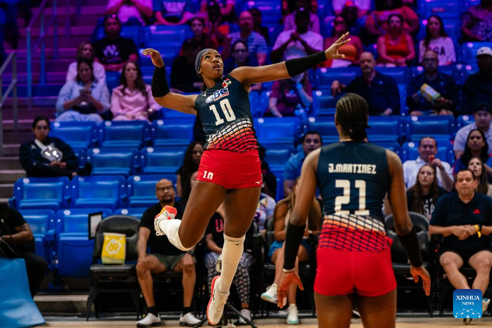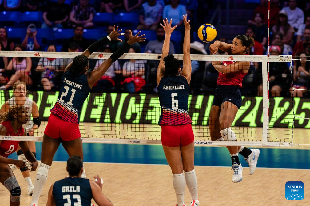 Samaret Caraballo of Dominican Republic competes during the match between the United States and Dominican Republic at the Women's Volleyball Nations League (VNL) 2025 in Arlington, the United States, July 10, 2025. (Photo by Chen Chen/Xinhua)