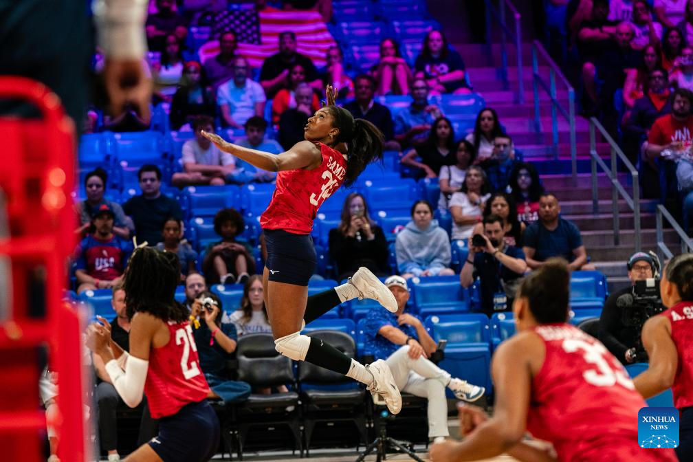 Stephanie Samedy (top) of the United States spikes during the match between the United States and Dominican Republic at the Women's Volleyball Nations League (VNL) 2025 in Arlington, the United States, July 10, 2025. (Photo by Chen Chen/Xinhua)