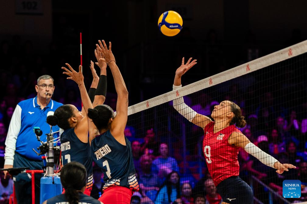 Madisen Skinner (1st R) of the United States spikes during the match between the United States and Dominican Republic at the Women's Volleyball Nations League (VNL) 2025 in Arlington, the United States, July 10, 2025. (Photo by Chen Chen/Xinhua)