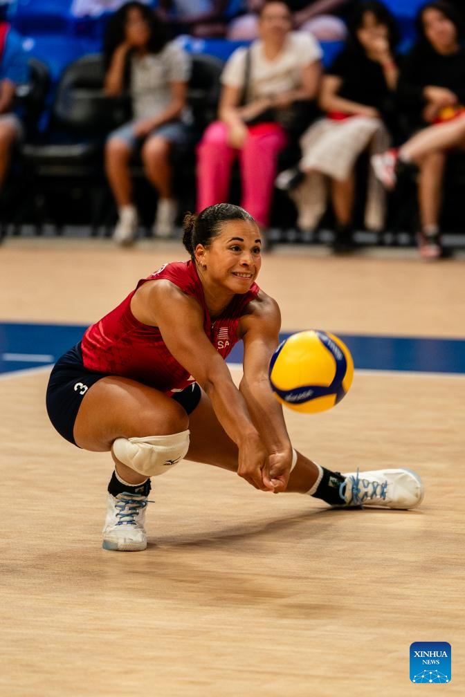 Avery Skinner of the United States digs during the match between the United States and Dominican Republic at the Women's Volleyball Nations League (VNL) 2025 in Arlington, the United States, July 10, 2025. (Photo by Chen Chen/Xinhua)