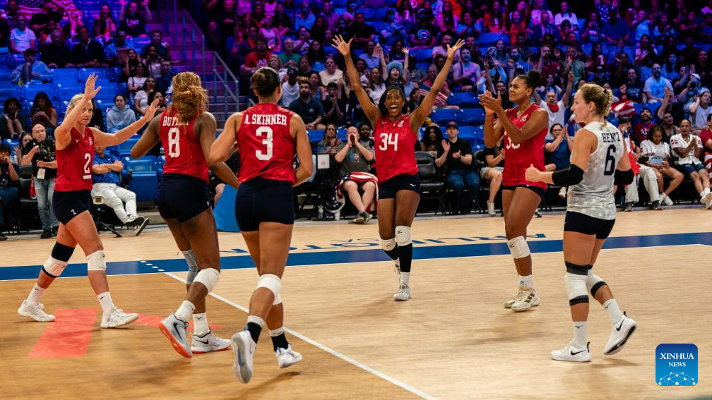 Players of the United States celebrate during the match between the United States and Dominican Republic at the Women's Volleyball Nations League (VNL) 2025 in Arlington, the United States, July 10, 2025. (Photo by Chen Chen/Xinhua)