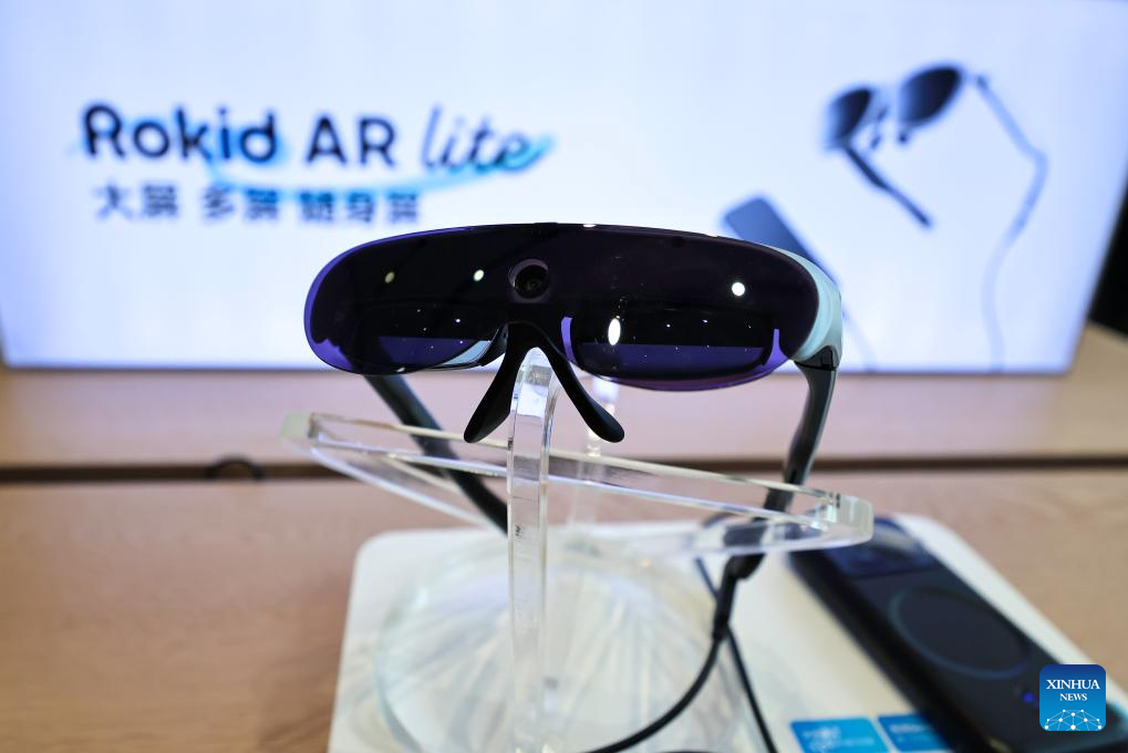 A pair of smart glasses developed by Hangzhou-based technology company Rokid is pictured at Rokid's flagship store in Yujiang District of Yingtan, east China's Jiangxi Province, July 10, 2025. The eyewear industry is a traditional sector in Yujiang District, with sales organizations dating back to the Qing Dynasty (1644-1911). Today, Yujiang ranks among the top eyewear industry bases in China, attracting numerous well-known enterprises. From handcrafted eyewear over 200 years ago to the smart glasses today, Yujiang has written a centuries-long legend in the field of optics. (Xinhua/Liu Jinhai)