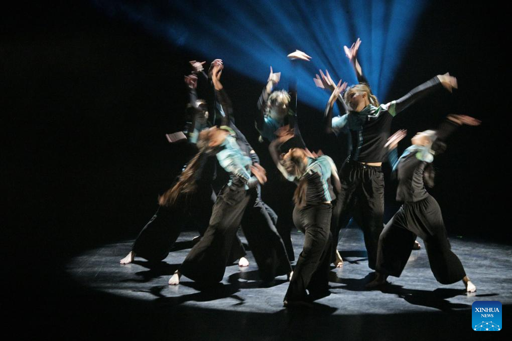 Dancers from School of the Arts (SOTA) perform the dance "Rainwoven" during the opening ceremony of the World Aquatics Championships 2025 held in Singtel Waterfront Theatre in Singapore on July 10, 2025. (Xinhua/Then Chih Wey)