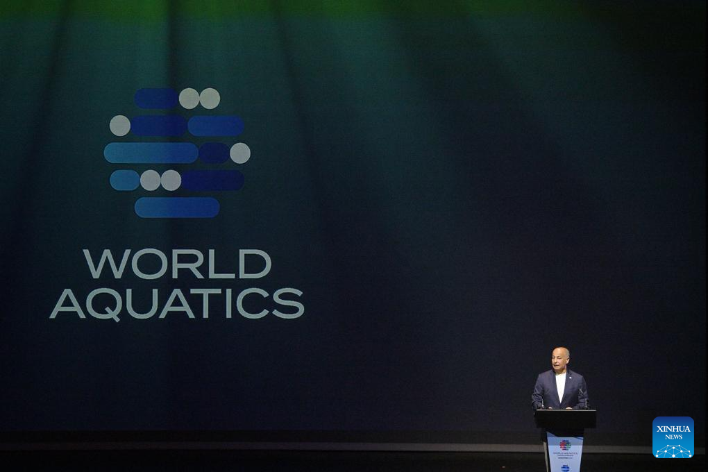 President of World Aquatics Husain Al Musallam speaks during the opening ceremony of the World Aquatics Championships 2025 held in Singtel Waterfront Theatre in Singapore on July 10, 2025. (Xinhua/Then Chih Wey)