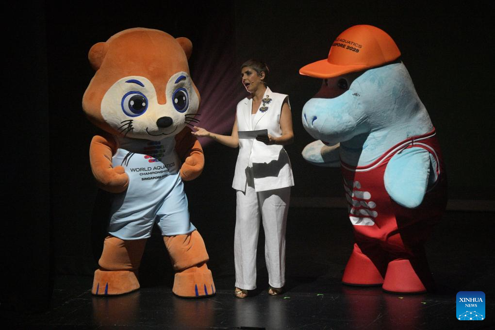 Official mascots otter Ollie (L) and dugong Dewey (R) make an appearance during the opening ceremony of the World Aquatics Championships 2025 held in Singtel Waterfront Theatre in Singapore on July 10, 2025. (Xinhua/Then Chih Wey)