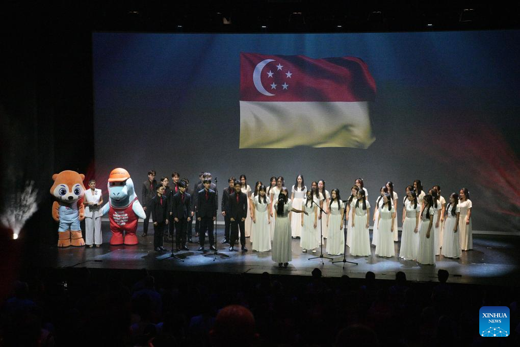 Choir singers of Victoria Junior College sing the Singapore national anthem during the opening ceremony of the World Aquatics Championships 2025 held in Singtel Waterfront Theatre in Singapore on July 10, 2025. (Xinhua/Then Chih Wey)