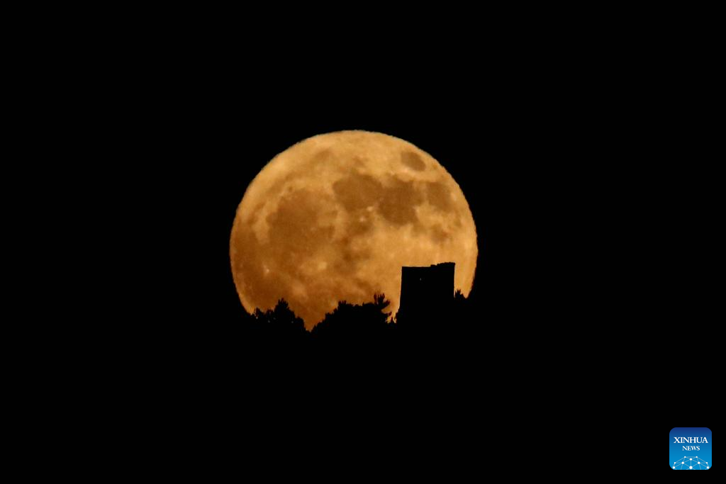 A full moon rises in the sky over Ajloun, north of Amman, Jordan on July 10, 2025. (Photo by Mohammad Abu Ghosh/Xinhua)