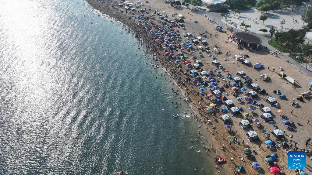 An aerial drone photo taken on July 10, 2025 shows a view of the beach of Fujiazhuang Park in Dalian, northeast China's Liaoning Province. Dalian has been experiencing continuous high temperatures in recent days. The beach of Fujiazhuang Park in Dalian attracted a large number of tourists to cool off. (Xinhua/Pan Yulong)