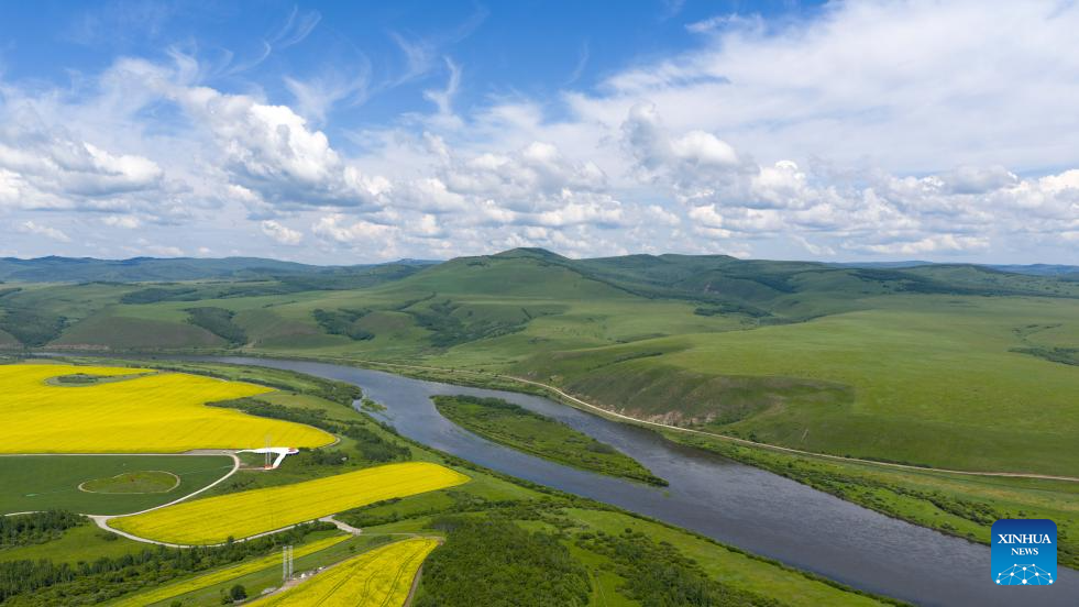An aerial drone photo shows a rapeseed flower field and the Ergun River in Ergun of Hulun Buir, north China's Inner Mongolia Autonomous Region, July 12, 2025. (Xinhua/Ma Jinrui)