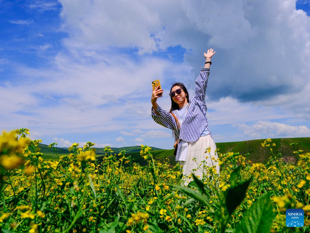 A tourist takes a selfie among rapeseed flowers in Ergun of Hulun Buir, north China's Inner Mongolia Autonomous Region, July 12, 2025. (Xinhua/Ma Jinrui)