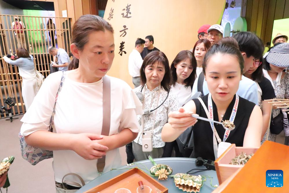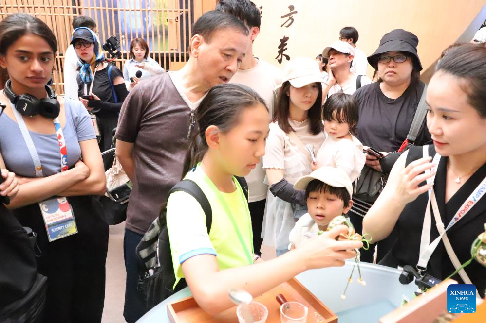 People watch a tea art display at the "Zhejiang Week" of China Pavilion at the Expo 2025 Osaka in Osaka, Japan, on July 12, 2025. The "Zhejiang Week" of China Pavilion at the Expo 2025 Osaka kicked off on Saturday. (Xinhua/Li Ziyue)