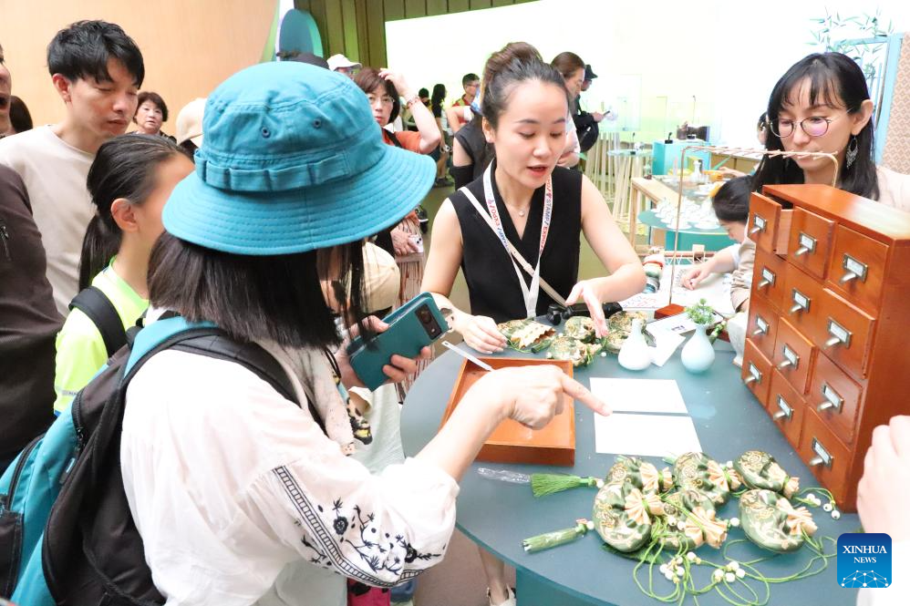 People try their hands at making traditional Chinese medicine sachets at the "Zhejiang Week" of China Pavilion at the Expo 2025 Osaka, in Osaka, Japan, on July 12, 2025. The "Zhejiang Week" of China Pavilion at the Expo 2025 Osaka kicked off on Saturday. (Xinhua/Li Ziyue)