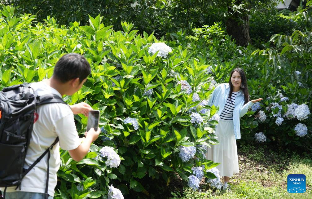 A tourist poses for a photo with flowers at a scenic area in Dali Bai Autonomous Prefecture, southwest China's Yunnan Province, July 11, 2025. Tourist destinations in Yunnan entered their peak tourism season as summer vacation began. (Photo by Hao Yaxin/Xinhua)