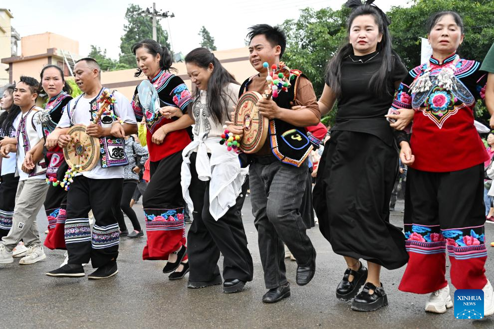Tourists dance with local people in Dali Bai Autonomous Prefecture, southwest China's Yunnan Province, July 12, 2025. Tourist destinations in Yunnan entered their peak tourism season as summer vacation began. (Photo by Luo Xincai/Xinhua)