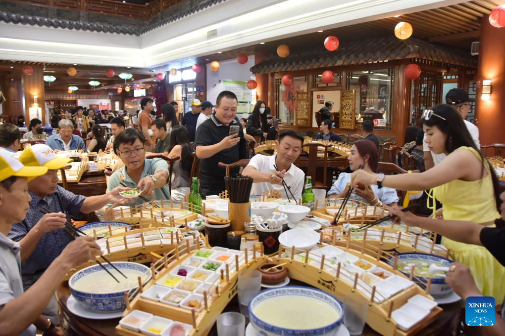 Tourists from Vietnam taste rice noodles in Mengzi, southwest China's Yunnan Province, July 12, 2025. Tourist destinations in Yunnan entered their peak tourism season as summer vacation began. (Photo by Xue Yingying/Xinhua)