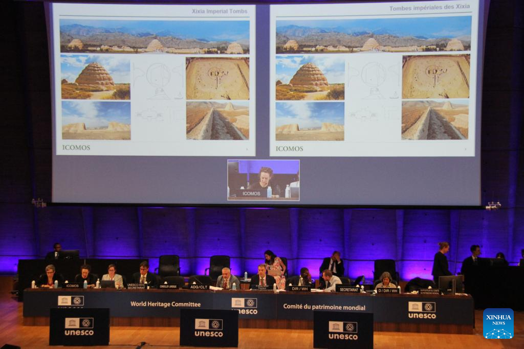 China's Xixia Imperial Tombs was presented during the 47th session of the World Heritage Committee in Paris, France, July 11, 2025. China's Xixia Imperial Tombs were officially added to the UNESCO World Heritage List on Friday during the 47th session of the World Heritage Committee held in Paris, France. The inscription brings the total number of World Heritage sites in China to 60. (Xinhua/Wang Songyu)
