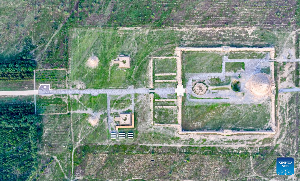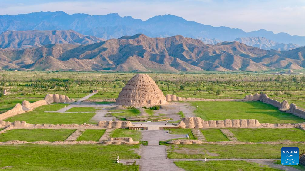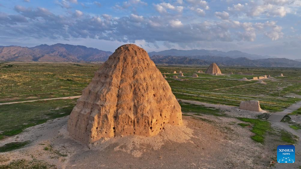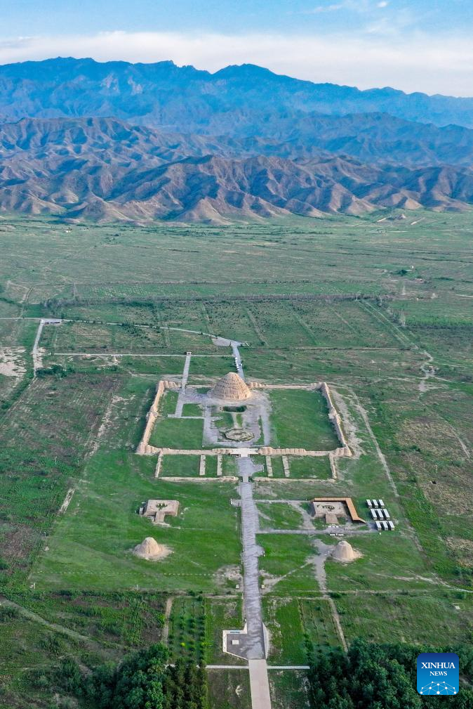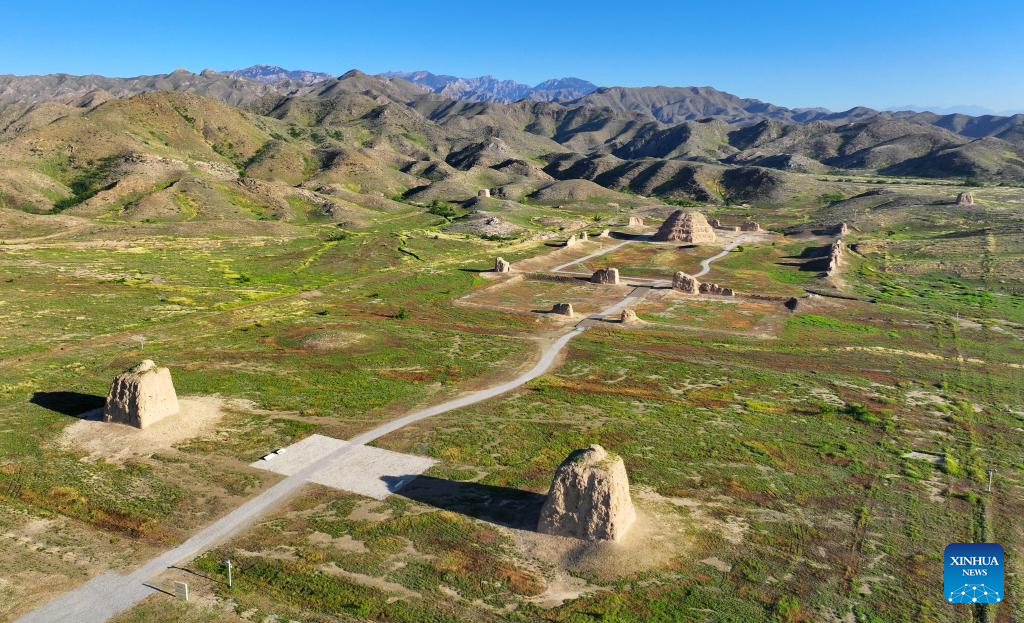 A drone photo taken on July 10, 2025 shows two Xixia imperial tombs in northwest China's Ningxia Hui Autonomous Region. China's Xixia Imperial Tombs were officially added to the UNESCO World Heritage List on Friday during the 47th session of the World Heritage Committee held in Paris, France.