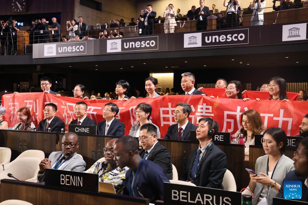 Chinese delegates celebrate the inscription of China's Xixia Imperial Tombs on the World Heritage List during the 47th session of the World Heritage Committee in Paris, France, July 11, 2025. China's Xixia Imperial Tombs were officially added to the UNESCO World Heritage List on Friday during the 47th session of the World Heritage Committee held in Paris, France.