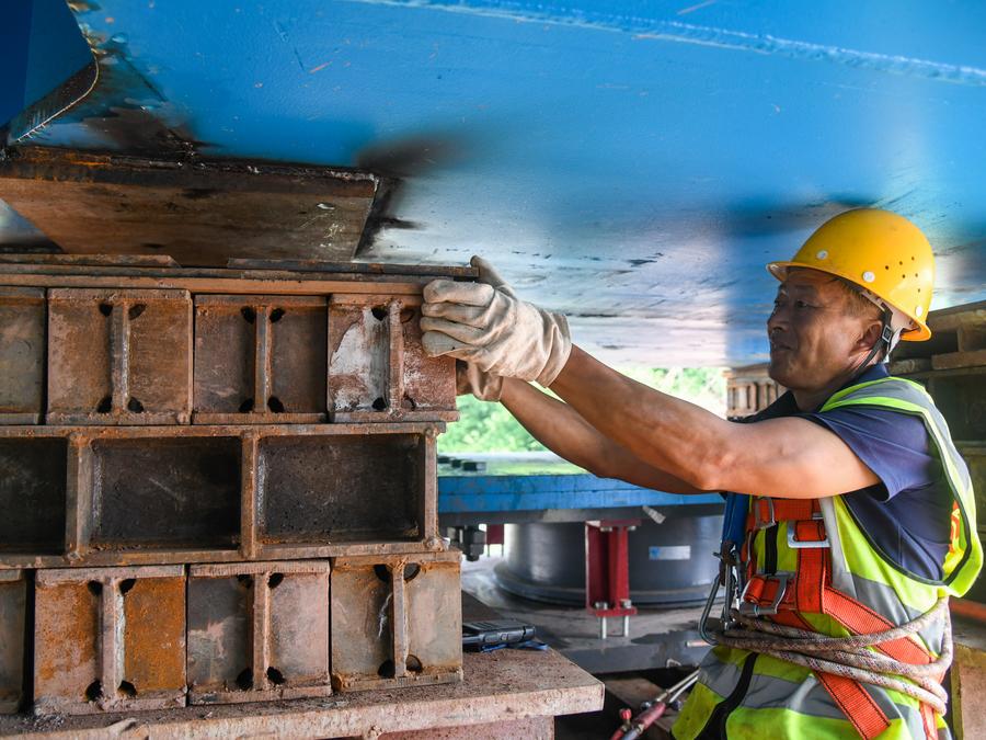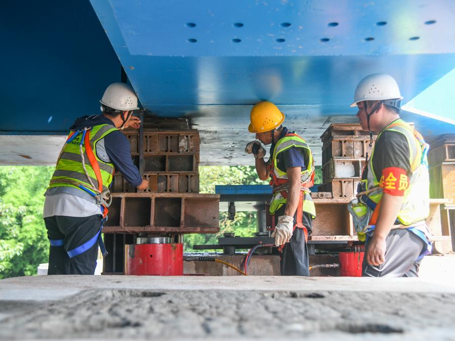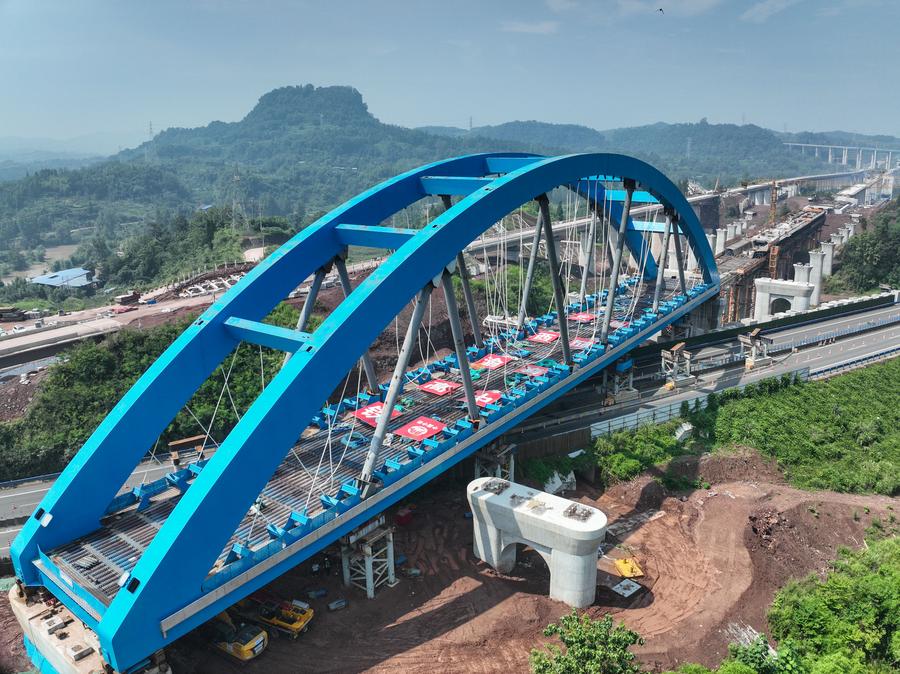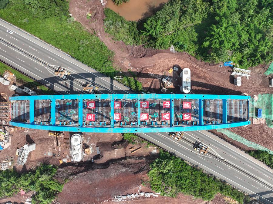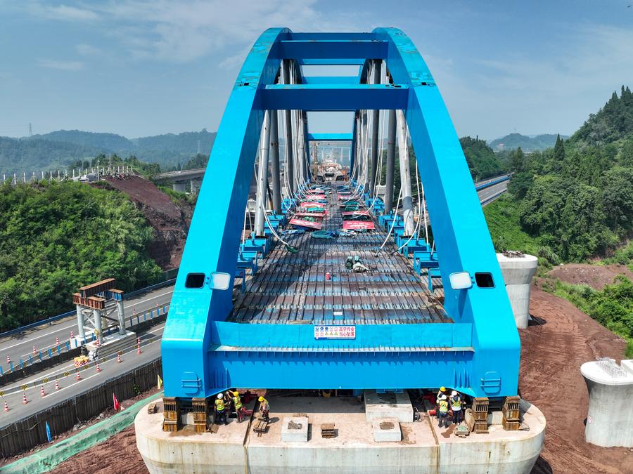 Workers work at the incremental launching construction site of a bridge of the Xi'an-Chongqing high-speed railway over an expressway in Dazhou, southwest China's Sichuan Province, July 11, 2025. (Xinhua/Wang Xi)A worker works at the incremental launching construction site of a bridge of the Xi'an-Chongqing high-speed railway over an expressway in Dazhou, southwest China's Sichuan Province, July 11, 2025. (Xinhua/Wang Xi)An aerial drone photo taken on July 11, 2025 shows workers working at the incremental launching construction site of a bridge of the Xi'an-Chongqing high-speed railway over an expressway in Dazhou, southwest China's Sichuan Province. (Xinhua/Wang Xi)Workers work at the incremental launching construction site of a bridge of the Xi'an-Chongqing high-speed railway over an expressway in Dazhou, southwest China's Sichuan Province, July 11, 2025. (Xinhua/Wang Xi)An aerial drone photo taken on July 11, 2025 shows a bridge of the Xi'an-Chongqing high-speed railway over an expressway under construction in Dazhou, southwest China's Sichuan Province. (Xinhua/Wang Xi)■