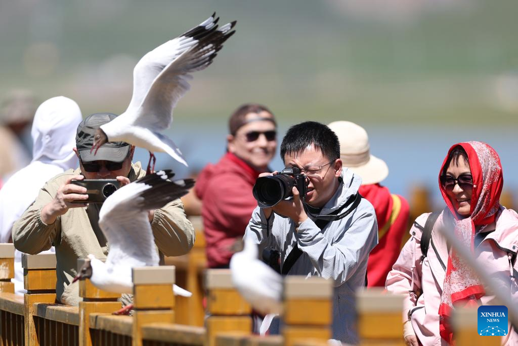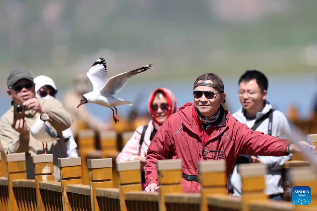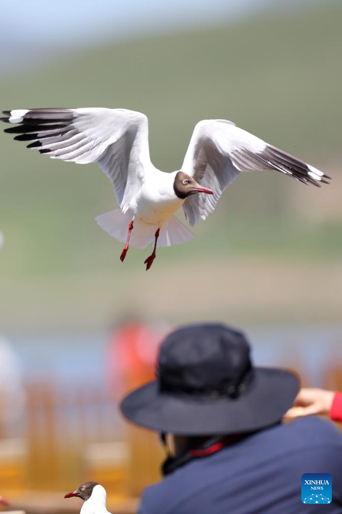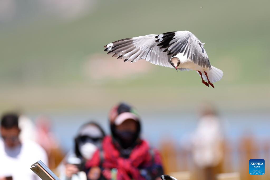Tourists watch brown-headed gulls at the Gahai wetland in Luqu County of the Tibetan Autonomous Prefecture of Gannan, northwest China's Gansu Province, July 11, 2025. Brown-headed gulls at the Gahai wetland attracted many tourists in summer. (Xinhua/Chen Bin)