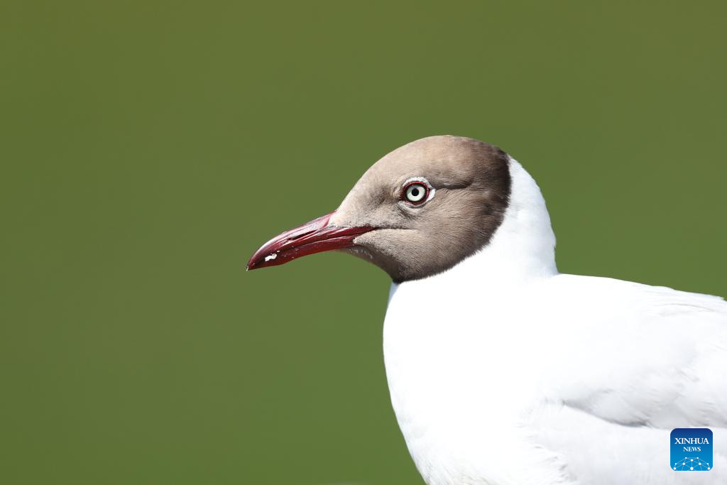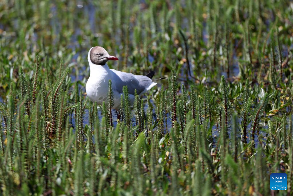 A brown-headed gull rests at the Gahai wetland in Luqu County of the Tibetan Autonomous Prefecture of Gannan, northwest China's Gansu Province, July 11, 2025. Brown-headed gulls at the Gahai wetland attracted many tourists in summer. (Xinhua/Ma Ning)