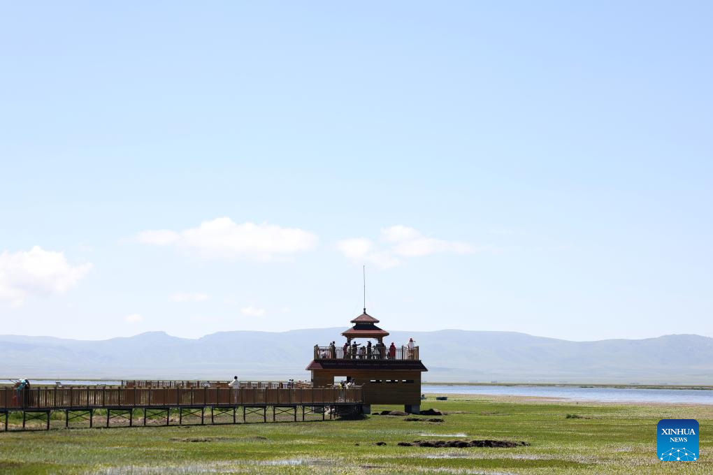 Tourists are seen on an observation deck at the Gahai wetland in Luqu County of the Tibetan Autonomous Prefecture of Gannan, northwest China's Gansu Province, July 11, 2025. Brown-headed gulls at the Gahai wetland attracted many tourists in summer. (Xinhua/Yu Lan)