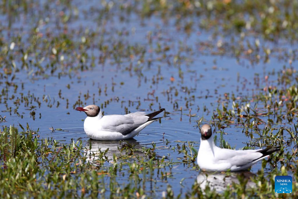 Brown-headed gulls fly over the Gahai wetland in Luqu County of the Tibetan Autonomous Prefecture of Gannan, northwest China's Gansu Province, July 11, 2025. Brown-headed gulls at the Gahai wetland attracted many tourists in summer. (Xinhua/Chen Bin)
