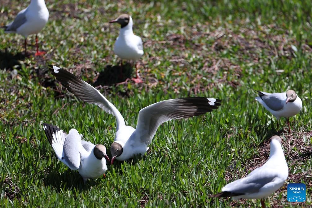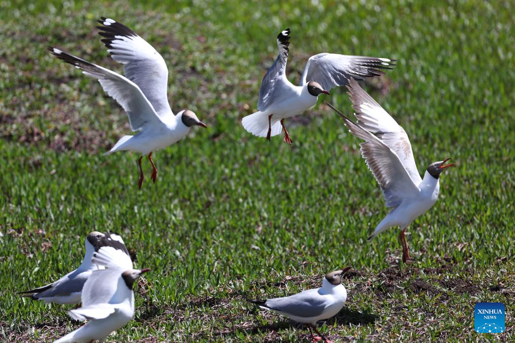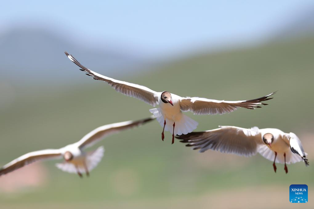 Brown-headed gulls play at the Gahai wetland in Luqu County of the Tibetan Autonomous Prefecture of Gannan, northwest China's Gansu Province, July 11, 2025. Brown-headed gulls at the Gahai wetland attracted many tourists in summer. (Xinhua/Yu Lan)