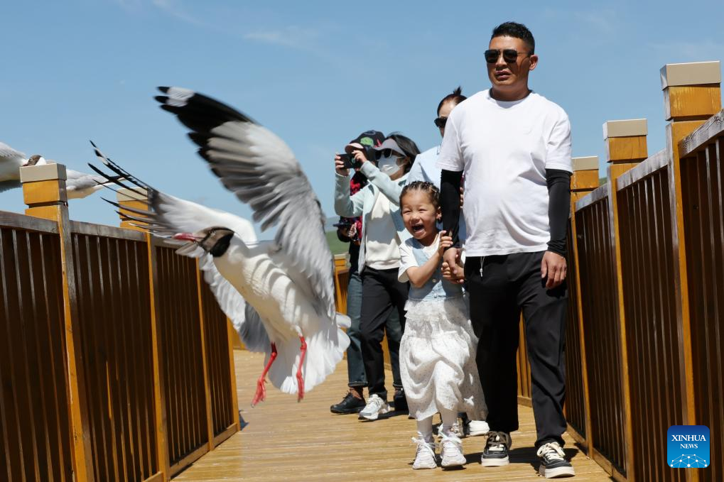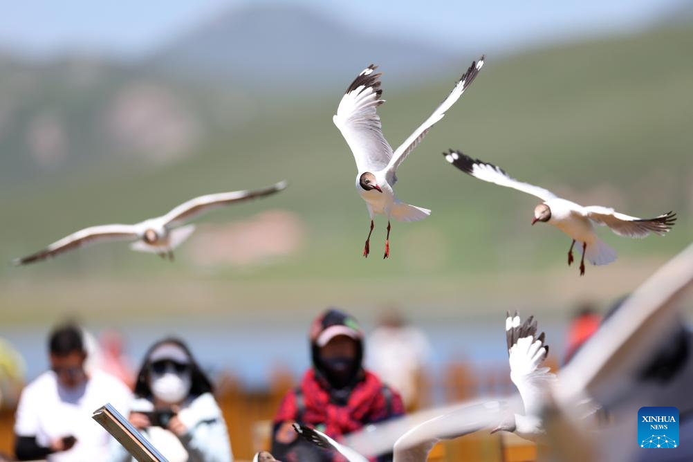 Tourists watch brown-headed gulls at the Gahai wetland in Luqu County of the Tibetan Autonomous Prefecture of Gannan, northwest China's Gansu Province, July 11, 2025. Brown-headed gulls at the Gahai wetland attracted many tourists in summer. (Xinhua/Ma Ning)