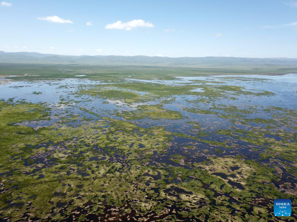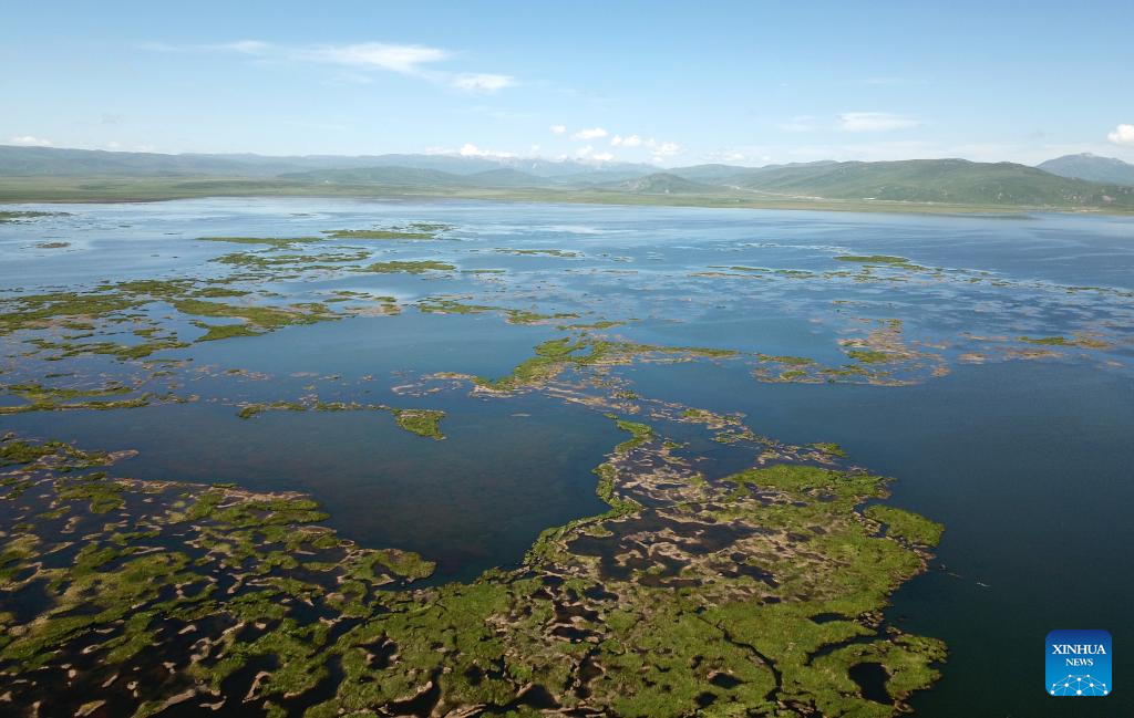 This aerial drone photo taken on July 11, 2025 shows the Gahai wetland in Luqu County of the Tibetan Autonomous Prefecture of Gannan, northwest China's Gansu Province. Brown-headed gulls at the Gahai wetland attracted many tourists in summer. (Xinhua/Ma Ning)