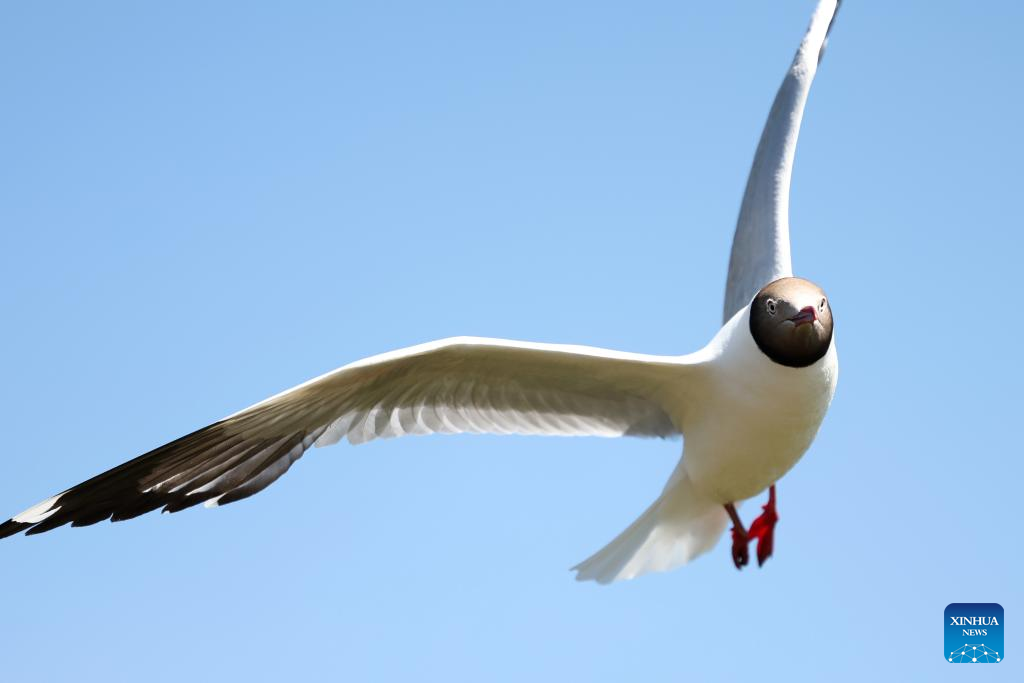 A brown-headed gull flies over the Gahai wetland in Luqu County of the Tibetan Autonomous Prefecture of Gannan, northwest China's Gansu Province, July 11, 2025. Brown-headed gulls at the Gahai wetland attracted many tourists in summer. (Xinhua/Chen Bin)