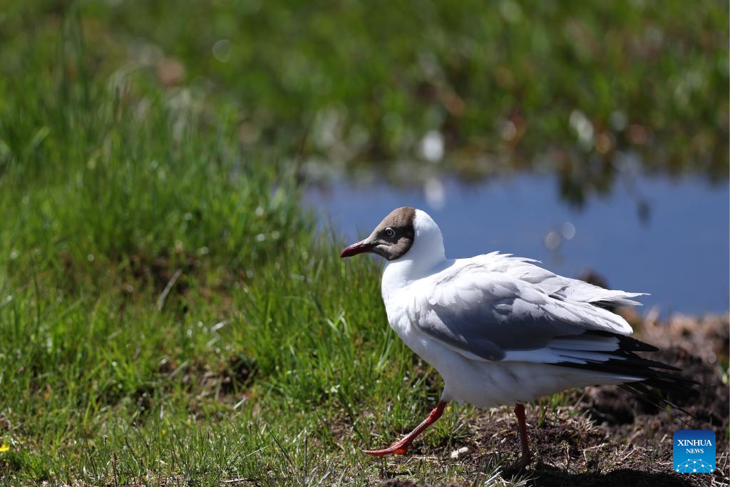 A brown-headed gull rests at the Gahai wetland in Luqu County of the Tibetan Autonomous Prefecture of Gannan, northwest China's Gansu Province, July 11, 2025. Brown-headed gulls at the Gahai wetland attracted many tourists in summer. (Xinhua/Chen Bin)