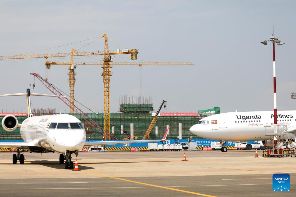 Uganda Airlines planes are seen as an airport expansion project takes place in the background at the Entebbe International Airport in Entebbe, Uganda, Aug. 17, 2023. (Photo by Hajarah Nalwadda/Xinhua)