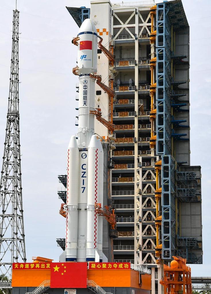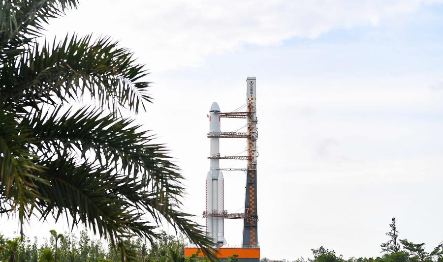 This photo taken on July 12, 2025 shows the combination of the Tianzhou-9 cargo craft, tasked with carrying supplies to China's space station, and a Long March-7 carrier rocket being vertically transferred to the launch site in Wenchang Spacecraft Launch Site in Wenchang, south China's Hainan Province. (Xinhua/Yang Guanyu)This photo taken on July 12, 2025 shows the combination of the Tianzhou-9 cargo craft, tasked with carrying supplies to China's space station, and a Long March-7 carrier rocket being vertically transferred to the launch site in Wenchang Spacecraft Launch Site in Wenchang, south China's Hainan Province. (Xinhua/Yang Guanyu)