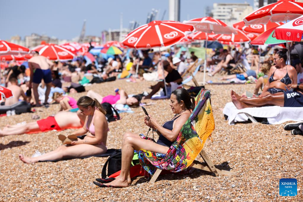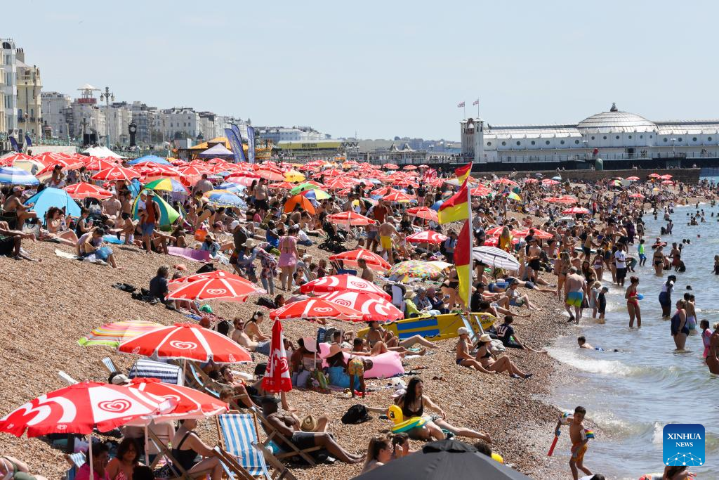 People enjoy their leisure time at the beach of Brighton, Britain, July 12, 2025. Britain is bracing for its third heatwave of the year with exceptionally hot and dry weather conditions prevailing in large parts of the country. (Xinhua)