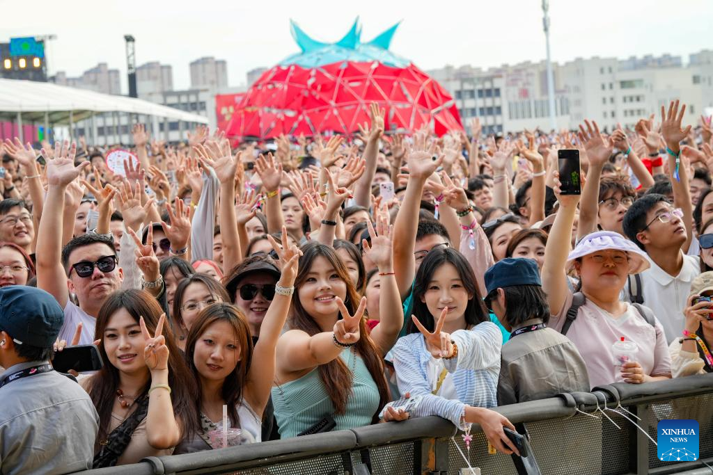Audiences are pictured during the Strawberry Music Festival in Urumqi, northwest China's Xinjiang Uygur Autonomous Region, July 12, 2025. The 2025 Strawberry Music Festival kicked off in Urumqi on Saturday. (Xinhua/Xu Hongyan)