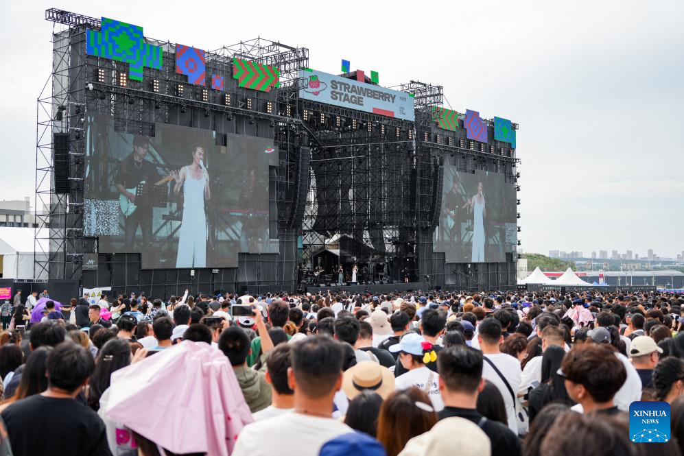 People watch performance during the Strawberry Music Festival in Urumqi, northwest China's Xinjiang Uygur Autonomous Region, July 12, 2025. The 2025 Strawberry Music Festival kicked off in Urumqi on Saturday. (Xinhua/Xu Hongyan)